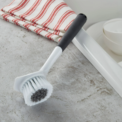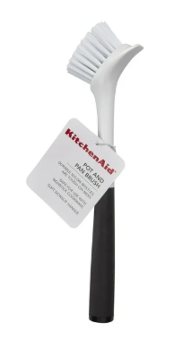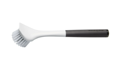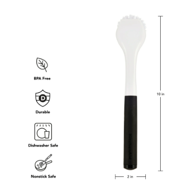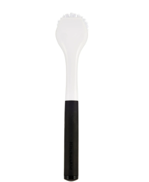 The KitchenAid Round Angled Brush is the ideal brush for cleaning bowls, pots, pans, and platters. The round-shaped head helps to reach curves and rounded areas on bowls, pots and pans. Features a built-in scraper to help with baked-on food. The durable, nylon bristles are safe for cleaning non-stick cookware and bakeware. A soft, non-slip handle provides a comfortable grip. Hand wash with soap. KitchenAid Round Sink Angled Brush with Black Soft Touch Handle : KE825CDBAW