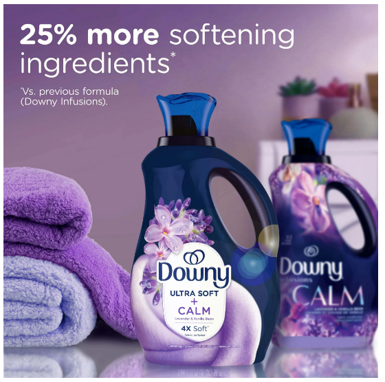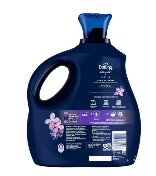 Transform your fabrics with luxurious softness and soothing scent with Downy Ultra Soft Fabric Softener Liquid. With 4X the softness* and a scent that lasts for days**, Downy Ultra Soft leaves your laundry feeling as amazing as it smells. Just pour it into your machine's fabric softener dispenser to feel and smell the difference. Infused with the scent of lavender and vanilla bean, you can let the CALM aroma surround you with any of your fabrics. Worried about your delicate fabrics? Don't be. Downy Ultra Soft has no dyes and is safe to use on all types of loads and machines, ensuring that every item, from your cozy sweaters to your delicate linens, receives the gentle care it deserves. Say goodbye to rough, stiff fabrics and hello to a world of unparalleled softness and freshness. For the ultimate laundry experience, pair Downy Ultra Soft Fabric Softener Liquid with your favorite detergent. Our fabric softener serves as the perfect companion, infusing your clothes with a burst of softness and scent. Elevate your laundry routine to new heights and immerse yourself in a world of unparalleled luxury. Experience the difference that Downy Ultra Soft brings to your fabrics and rediscover the joy of soft, beautifully scented fabrics. Try it today and embrace a new level of softness and scent that will leave you wanting more. Directions: Simply measure and pour your desired amount of fabric softener into the separate dispenser or into the center agitator. *Softening ingredients vs leading liquid detergent alone.**Up to 4 days- 93 fl oz, 138 Loads