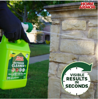 Power through tough stains with Home Armor Outdoor Cleaner+. This outdoor cleaner removes mold, mildew, dirt, grime, and algae stains with its effective formula. For outdoor use only, it is ideal for cleaning brick, wood, concrete and vinyl. To clean and/or remove tough stains, attach hose to bottle, ensure it is in the “OFF” position and rinse surrounding plants with water. Then turn to “CLEAN” or “CLEAN+” and spray affected surface. Wait 10 minutes and then thoroughly rinse off surface and surrounding plants. Do not use on cedar or redwood that is less than 2 years old and avoid contact with metal surfaces, clothing, carpet, fabrics, floor coverings or vegetation. Product will not remove pigmented wood stains or sealers. Oxidation from sun and elements can cause permanent discoloration on outside surfaces. Test on an inconspicuous area before using. Keep away from children and follow all directions carefully.