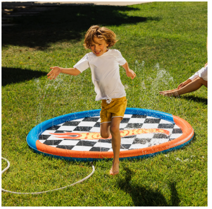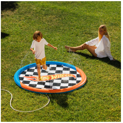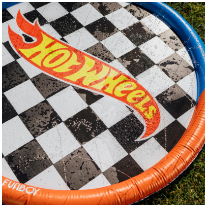 Cool off in style with the Hot Wheels™ Splash Pad by FUNBOY! Featuring black-and-white checkered stripes and the iconic flame logo, this 64" splash pad delivers high-speed summer fun. No inflation required, just connect your garden hose and water sprays across the pad for hours of play. Made from durable, it’s perfect for kids to splash and stay cool all season long. Rev up your backyard adventures with this must-have Hot Wheels™ Splash Pad! Children ages 6+